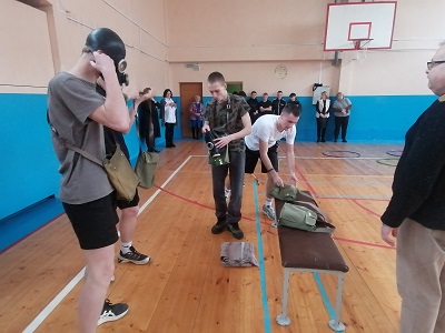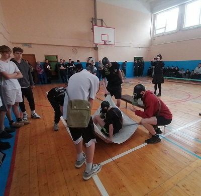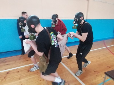 Каждая команда в составе пяти человек проходила на время полосу препятствий, которая кроме спортивных элементов включала в себя одевание противогаза и переноску раненого на носилках.