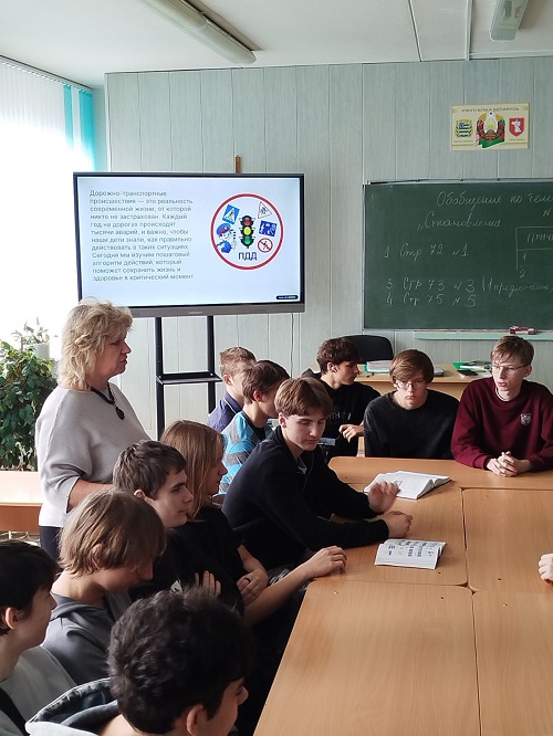 Учащимся была показана презентация "Алгоритм действий для детей и подростков при ДТП" с последующим обсуждением. Для закрепления и обобщения информации с ребятами была проведена викторина на знание ПДД.