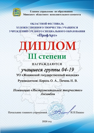 Диплом 3 степени областного фестиваля художественного творчества учащихся учреждений среднего специального образования «ПрофАрт» в номинации «Инструментальное творчество» получил коллектив группы 04-19, под руководством мастера производственного обучения Корень О.А. и куратора группы Печень Н.В.
