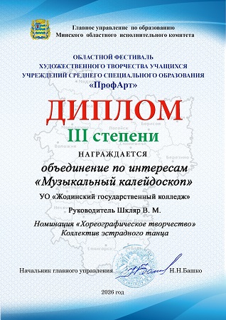 Диплом 3 степени областного фестиваля художественного творчества учащихся учреждений среднего специального образования «ПрофАрт» в номинации «Хореографическое творчество» получил коллектив эстрадного танца группы 06-32 объединения по интересам «Музыкальный калейдоскоп» с участием мастера производственного обучения Сморгович Н.Г.;