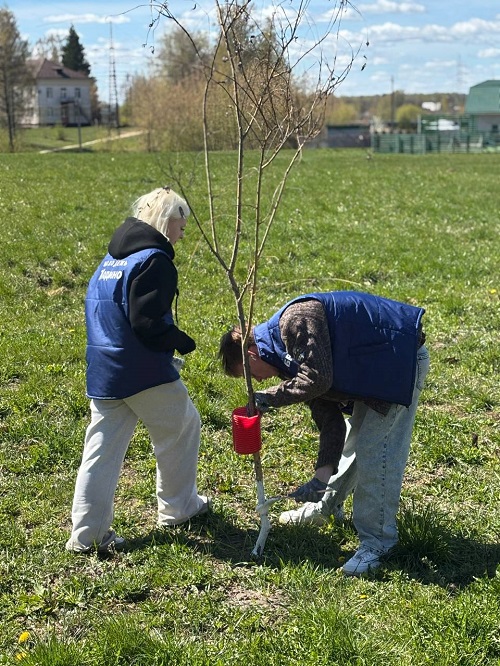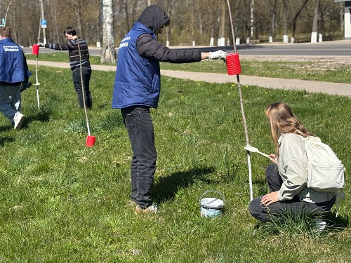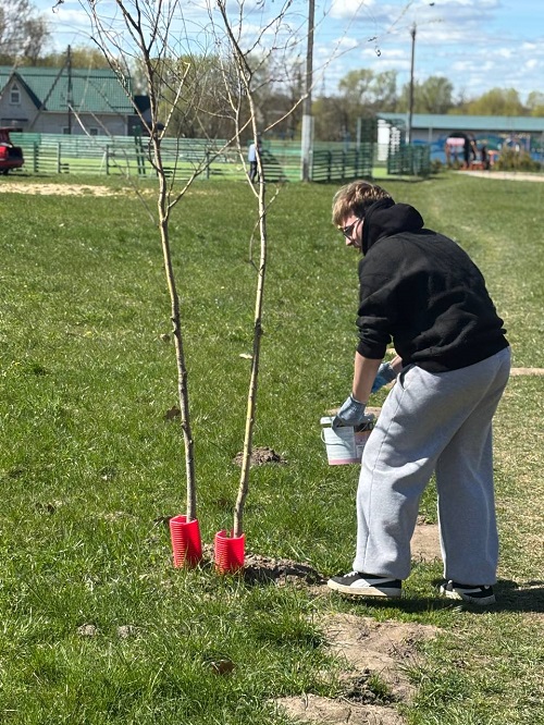 Ребята побелили клены, которые были высажены здесь ровно год назад. Но это не просто деревья, а настоящий зеленый символ страны, «живой флаг».